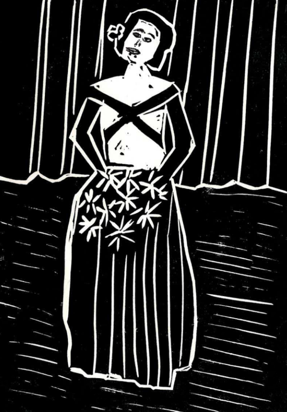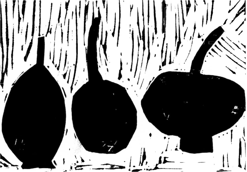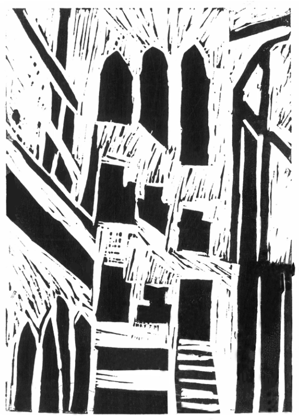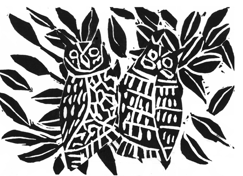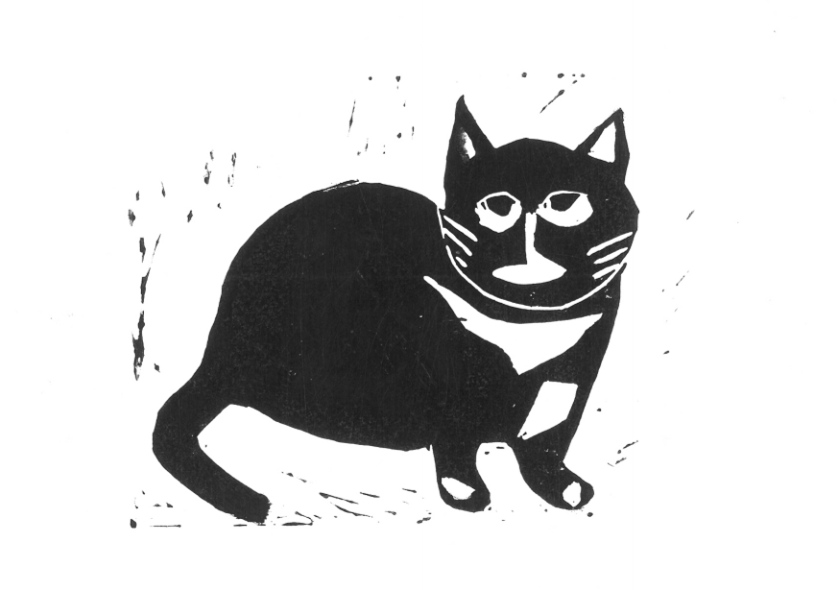 I first worked with linoleum, cutting tools, printing paper and black ink, experimenting with images such as birds, plants, buildings, people and a cat. I found this process very exciting. Creating pictures with my hands in this way was a very new experience for me.